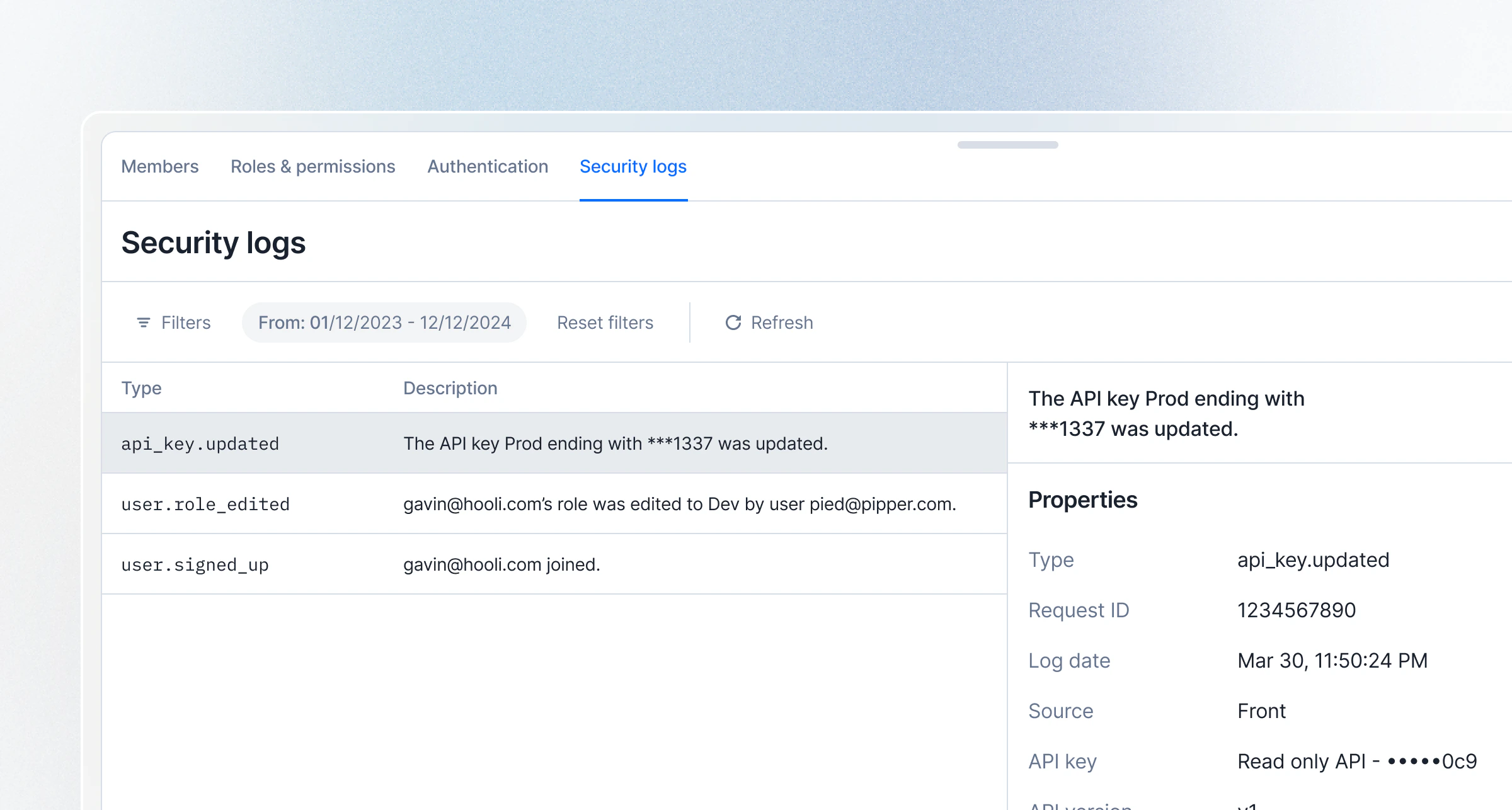 • API-first: Query security logs programmatically via the GET /api/v1/security_logs endpoint