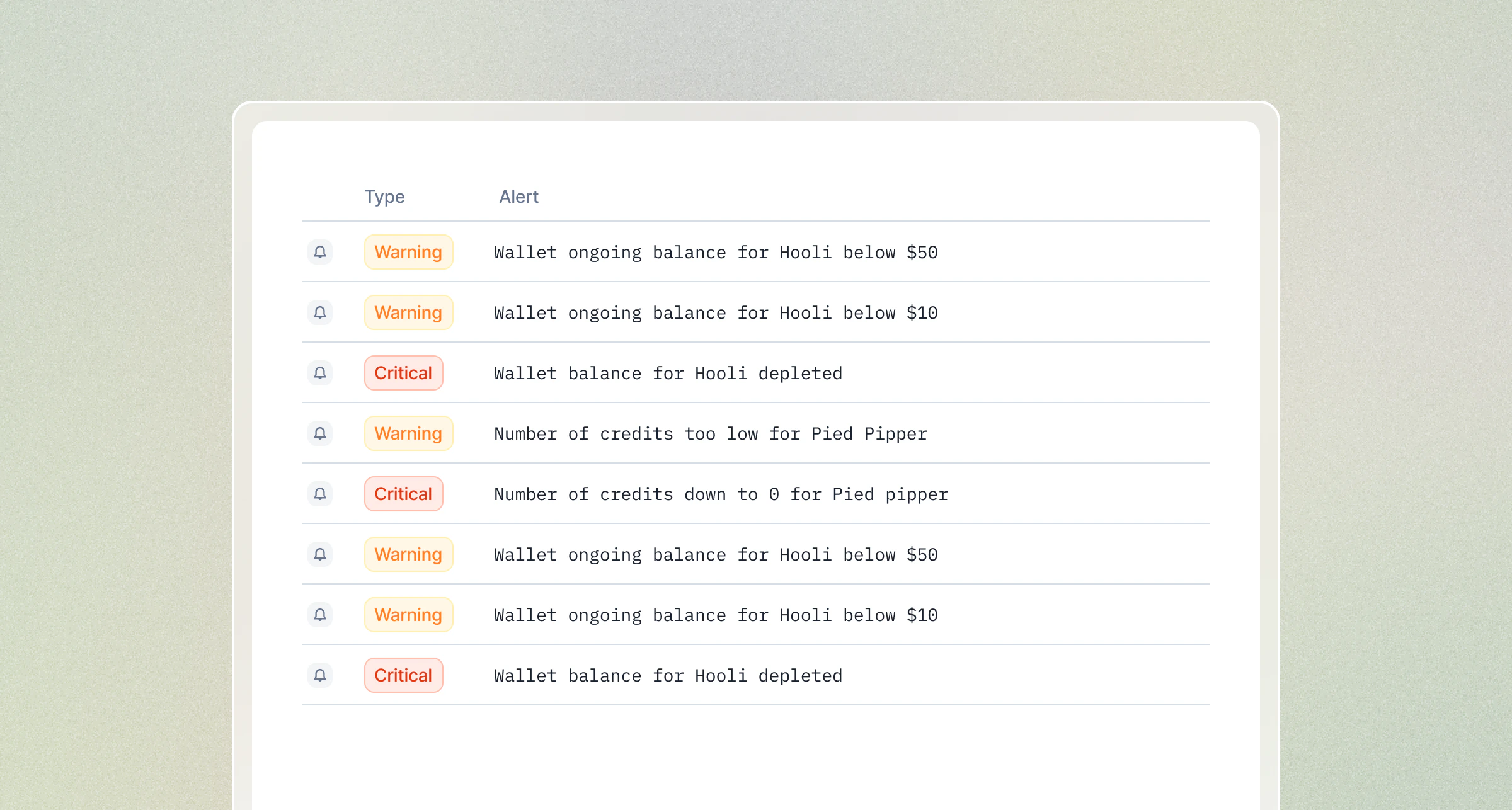 Whether you’re powering a self-serve credits experience or managing enterprise wallets at scale, wallet alerts give you the control to keep customers informed and revenue flowing.Learn more