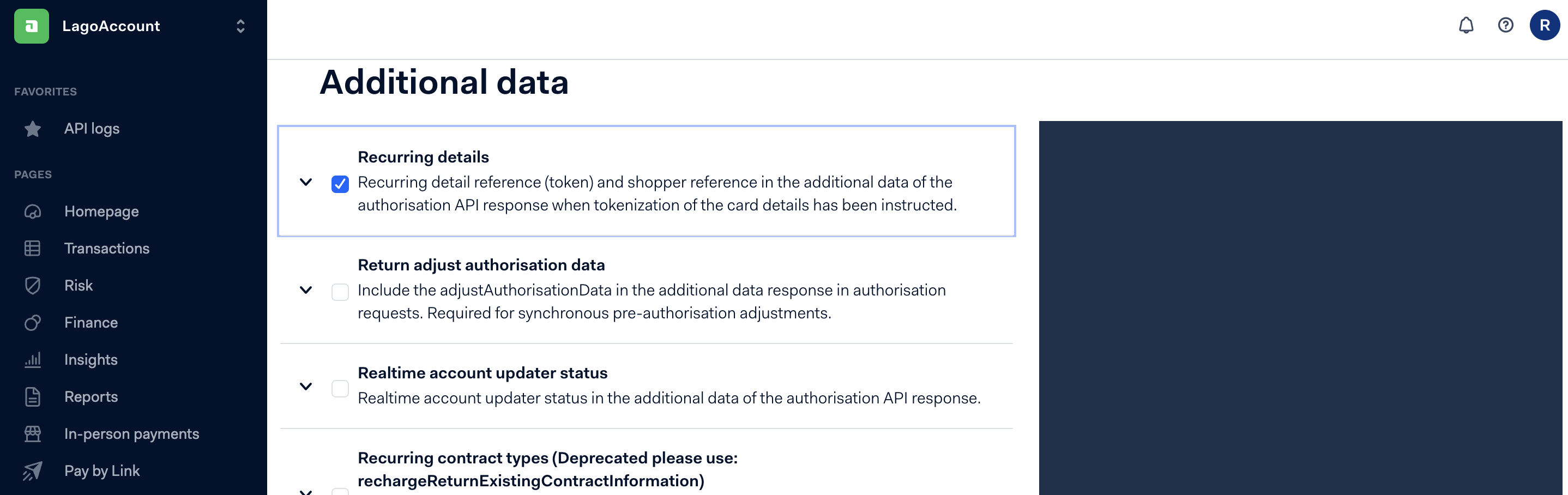In Adyen, to enable recurring payments for a stored payment method, follow these steps:- Go to Developers > Additional Data;